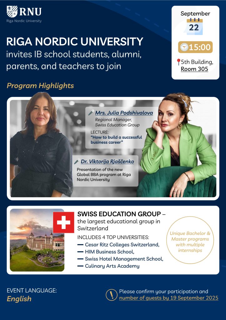 Riga Nordic University invites students, alumni, parents and teachers to participate in an interactive masterclass on 22 September 2025 at 22.00. 15:00, 5. in Room 305, Valerija Seiles iela 1, Riga.
