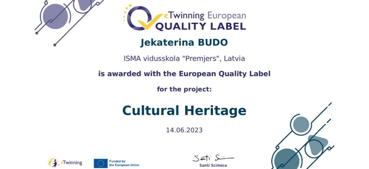 Mūsu eTwinning projektam “Kultūras mantojums” ir piešķirts Eiropas kvalitātes sertifikāts.